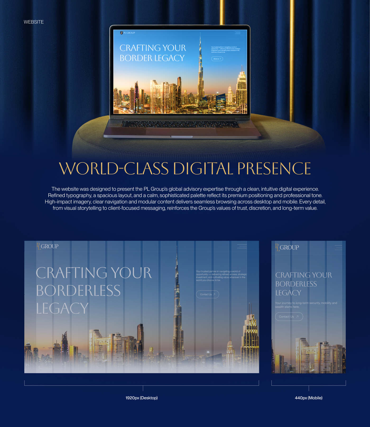 The website was designed to present the PL Group’s global advisory expertise through a clean, intuitive digital experience. Refined typography, a spacious layout, and a calm, sophisticated palette reflect its premium positioning and professional tone. High-impact imagery, clear navigation and modular content delivers seamless browsing across desktop and mobile. Every detail, from visual storytelling to client-focused messaging, reinforces the Group’s values of trust, discretion, and long-term value.