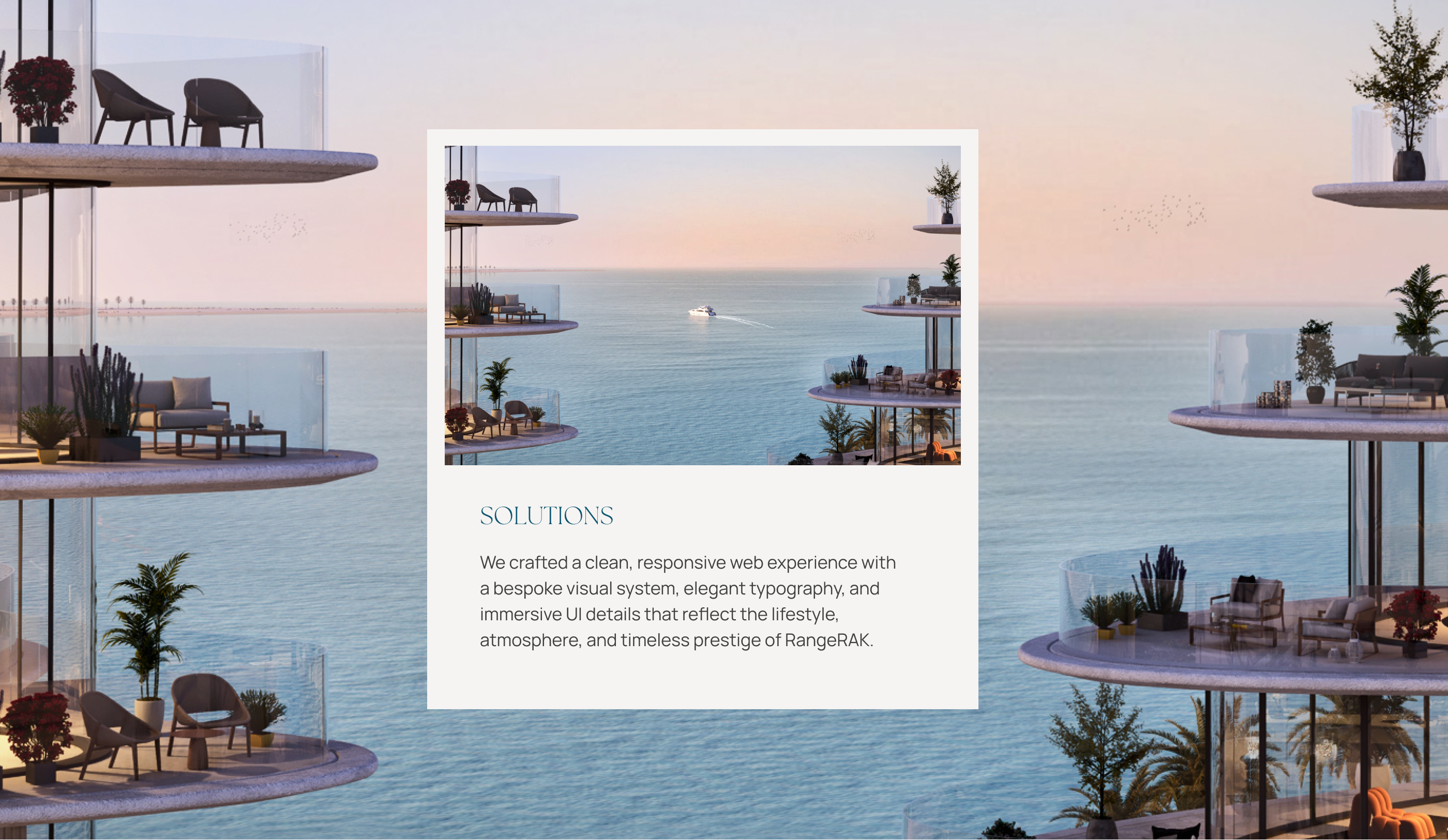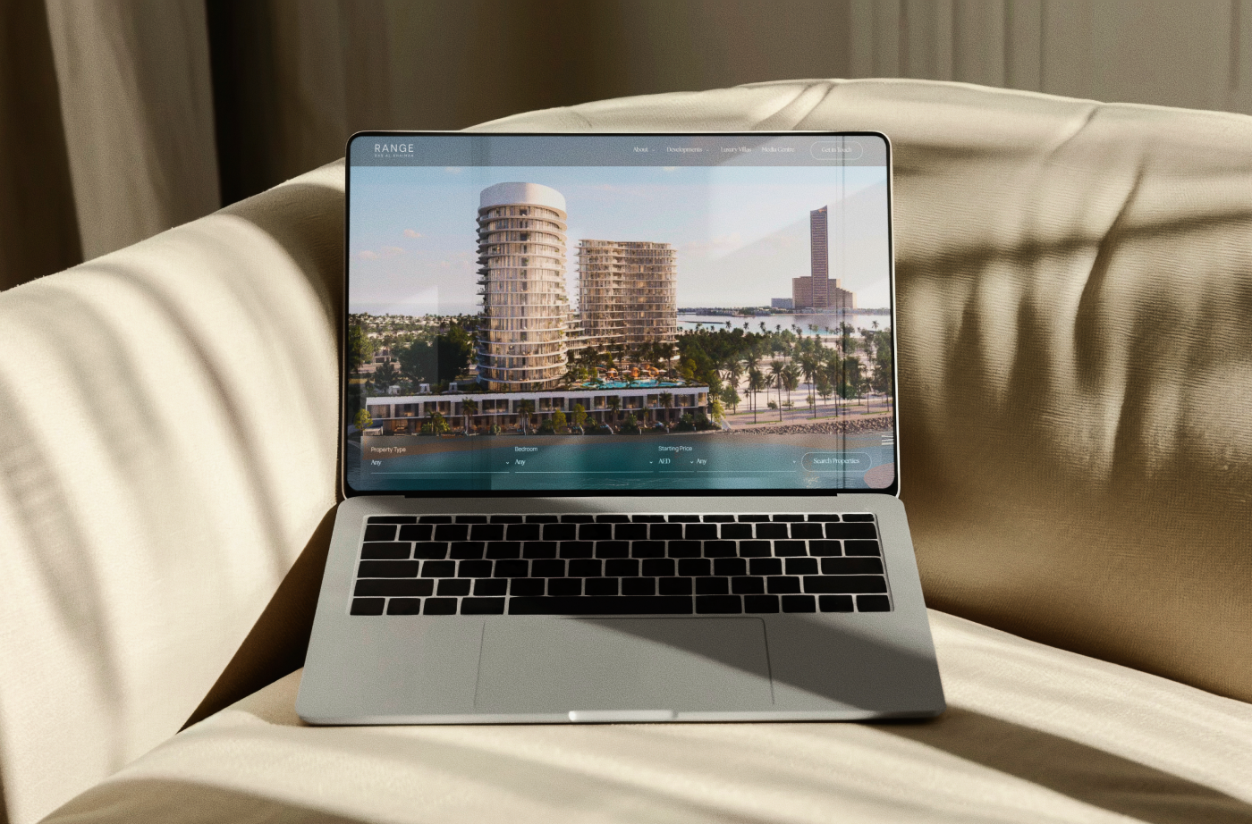 RangeRAK is a luxury beachfront development located on Al Marjan Island in the UAE. Developed by Range Developments, it brings together the relaxed elegance of the Caribbean with the clean lines of modern architecture. The property offers a peaceful coastal lifestyle, designed for those who value sophistication and tranquility. To reflect this vision, the website was created as a calm, immersive experience. It communicates the brand’s sense of luxury through thoughtful design and consistent visual language, offering a seamless journey for users across devices.